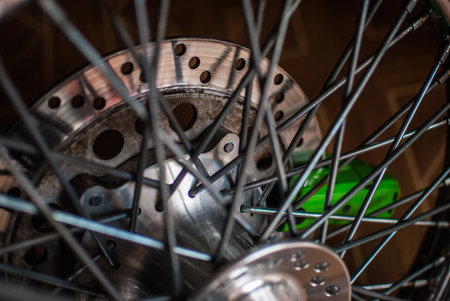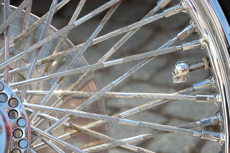 Closeup photo of motorcycle wheel with shiny spokes and metallic rim.