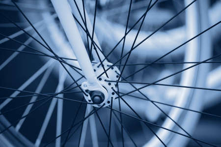 Axel and spoke section close-up of bicycle wheel in a cycle workshop. Shallow depth of field.