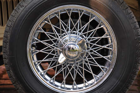 a shiny disc, black and white, a wheel of a car of old times. Close up of vehicle details. Concept of style and racing. Selective focus