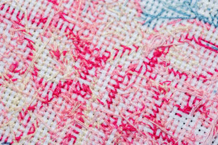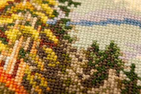 Cross-stitch embroidered pattern on fabric, handmade, close-up.