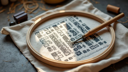Traditional japanese calligraphy on linen in wooden hoop. That the image is generated using AI.