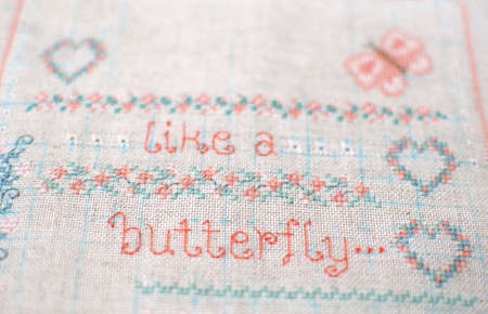 Cross-stitch embroidery on linen. Sampler with floral patterns, hearts and butterfly. Close up. Selective focus.