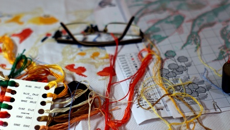 Sewing and ambroidery craft kit, embroidery and other tools, selective focus