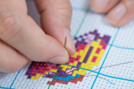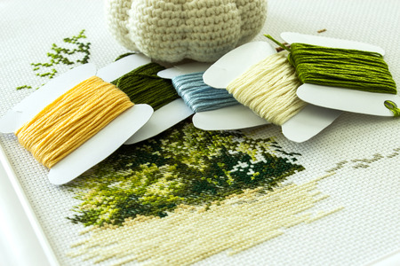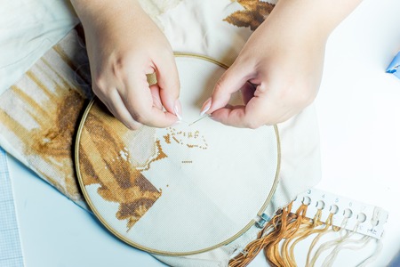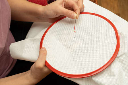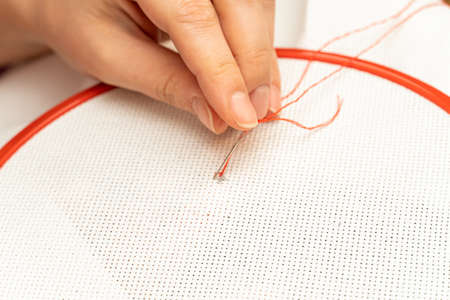 Cross stitching embroidery process. Needle embroidery frame threads. Hobby DIY lifestyle.