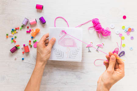 Mature lady hands doing cross stitching with threads and beads. Top view on wooden white background.