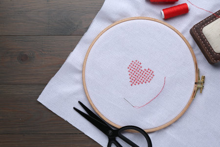 White cloth with embroidered red heart, needle and scissors on wooden table, flat lay