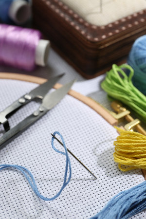 Close-up on a sewing needle with a thread lying on top of a cross-stitched section of a canvas with a pattern. piece of embroidery