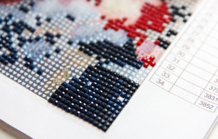 Close up of a diamond painting craft art project using tweeters for embroidery focus