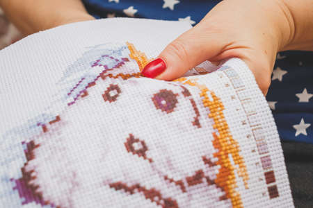 Favorite activity during the pandemic. A woman sitting on a sofa is embroidering with a cross on a canvas with a pattern. Woman's hands.