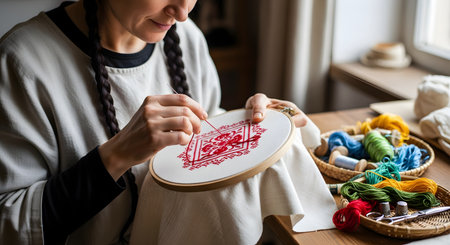 Close-up shot of a woman with pigtail braids concentrating on hand-stitching a traditional red geometric pattern onto white fabric. She is using an embroidery hoop, with colorful threads and a thimble nearby on a wooden table.
