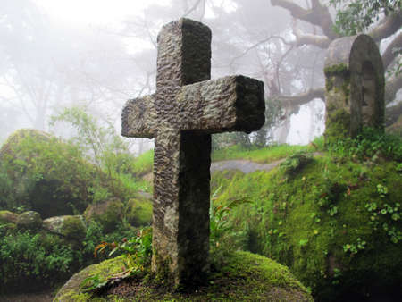 stone concrete cross religion sigh on ground hill with forest spruce needle trees dark green moody foliage unfocused background scenic view space