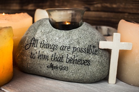a stone with christian scripture with light candle cross
