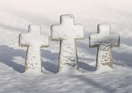 Granite crosses in the German cemetery in winter.
