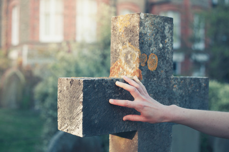 A woman's hand is touching a gravestone at sunset