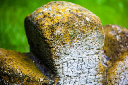 Old moss-grown stone cross with engraved Old Church Slavonic inscriptions. Kyiv, Ukraine. Close up.
