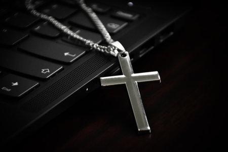 Metal cross necklace on notebook keyboard, soft and selective focus on cross necklace.