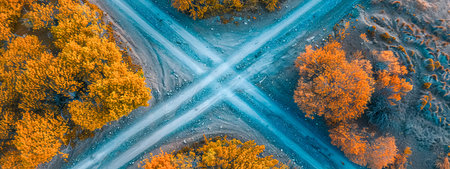Aerial view of crossroads in autumn forest