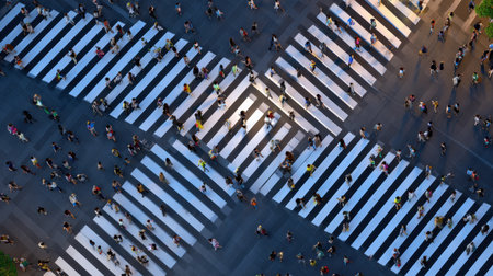 A vibrant aerial view of pedestrians navigating a busy crosswalk in an urban city during daylight.