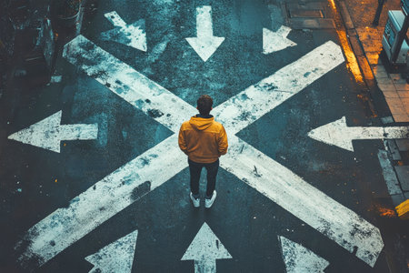 A man in a yellow hoodie reflects on decisions at a crossroad, surrounded by arrows indicating different paths in the dim twilight ambiance of a bustling street.