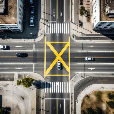 Aerial view of multiple traffic lights at a complex intersection, showing their synchronization and the flow of vehicles and pedestrians.