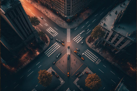 An AI generated illustration of an aerial shot of a busy intersection, with cars passing through the junction below and buildings in the background