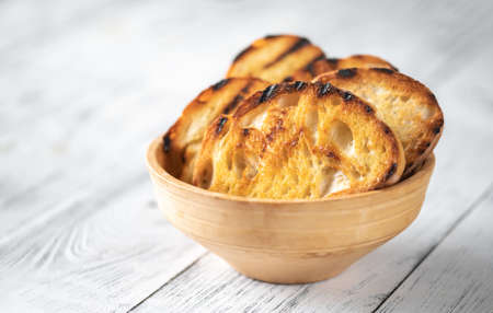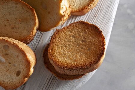 A closeup view of dry bread slices under the lights isolated on a grey background.