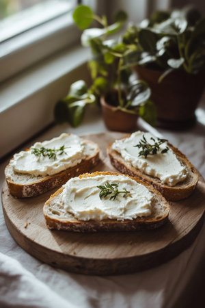AI Generated. Deliciously creamy goat cheese spread generously layered on artisan bread perfect for any gourmet breakfast or snack