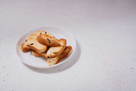 Wheat bread rusks, crackers, sweet croutons with raisins on white plate, wooden background. Tasty homemade appetizer. Copy space