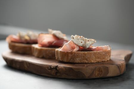 Bruschetta with panchetta, ricotta and fig jam, shallow focus