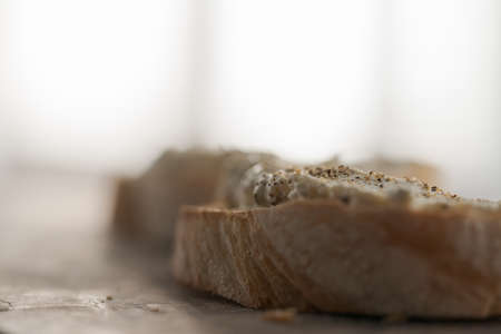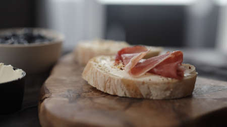 Ciabatta slices with cream cheese and herbs on olive wood board