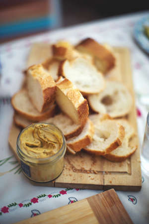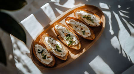 Slices of crusty bread topped with creamy spread and fresh herbs are arranged neatly on a wooden platter under natural light, creating a warm and inviting atmosphere.