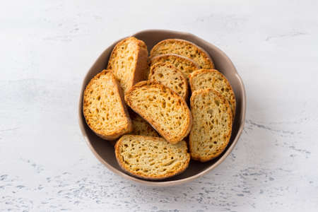 Ceramic bowl with traditional Italian biscotti cheese croutons on a light gray background, top view. Delicious homemade food