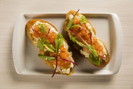 Bruschetta with chopped mango, cress and goat cheese on fresh baguette on the table.