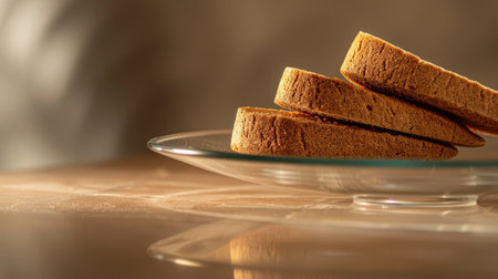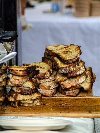 Golden brown toasted bread slices, crispy crust, fresh morning breakfast treat