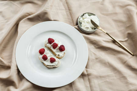 aesthetic breakfast camembert, cream cheese and raspberries in bed