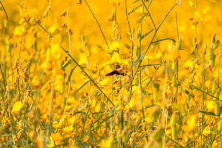 Colorful yellow flowers field in bright sunlight. Sunn hemp flowers are in bloom, bumblebee and bee flying while collecting a pollen of sunn hemp. Natural spring scene. Selective focus.
