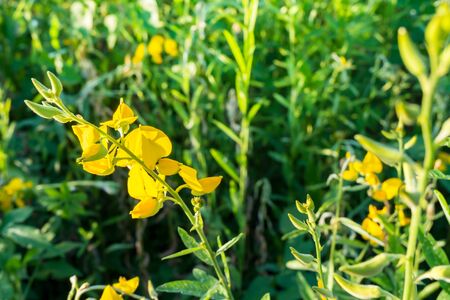 Beautiful yellow Sun hemp flowers or Crotalaria juncea farm in beautiful sunlight on the mountain in Thailand.A type of legume.