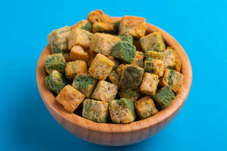 Fried croutons of bread on a blue wooden table