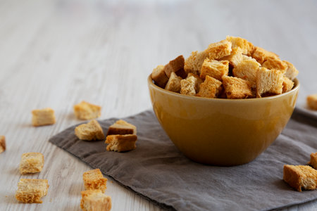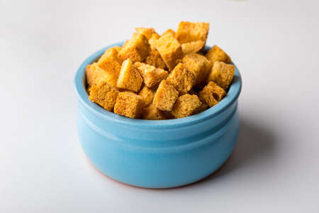 Homemade Crispy Bread Croutons in a Bowl, side view. Close-up.