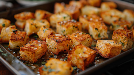 food photography, close-up of golden-brown garlic croutons on a baking sheet, ready to add crunch to a bowl of soup or salad