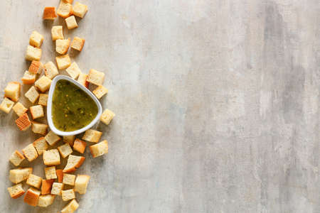 Croutons in a bowl on a gray background, top view.