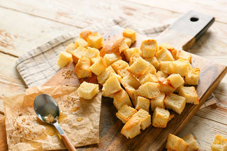 Board with croutons, spoon, parchment paper and napkin on light wooden background, closeup