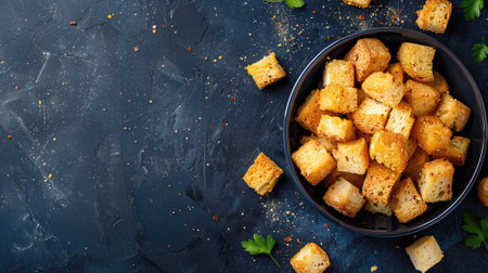 Homemade Crispy Bread Croutons in a Bowl, top view. Copy space.