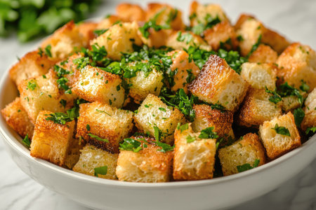 Generative AI : homemade croutons in white ceramic bowl