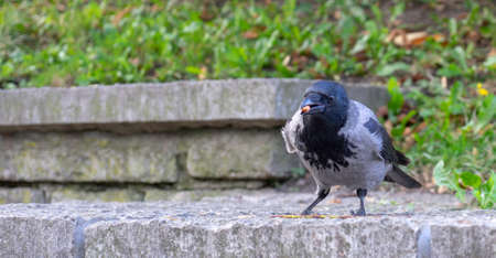 Rook bird with walnut in his beak (Corvus frugilegus)
