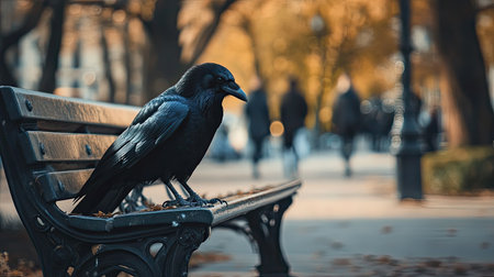 A striking raven sits gracefully on a park bench among golden autumn leaves, observing passersby as the soft light of evening creates a tranquil atmosphere.