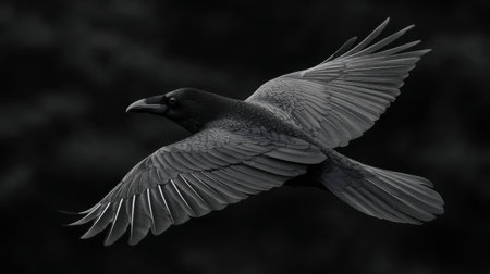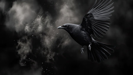A stunning black bird takes flight against a dark and mysterious background, creating an ethereal atmosphere. The wings spread wide, showcasing grace and beauty.