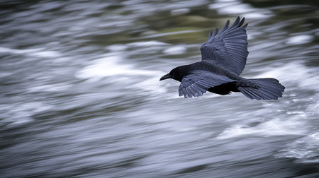 A stunning image of a black bird gracefully flying over a shimmering body of water, captured in motion for a lively portrayal of nature's elegance.