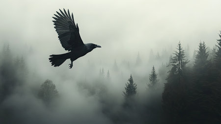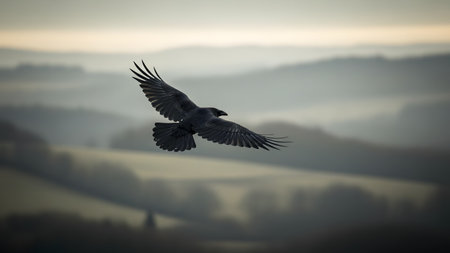 A black raven flies gracefully through the air with its wings fully spread against a backdrop of rolling hills and misty valleys. The moody, desaturated tones emphasize the bird's silhouette and the vastness of the natural landscape.