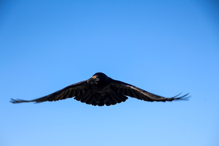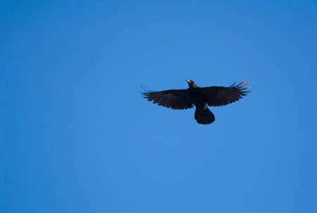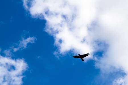 A beautiful silhouette of a flying crow against the blue sky. Flying bird in cloudy day.